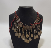 ÜZERİ KABARTMA İŞÇİLİKLİ ZİNCİRLERİ İSE AŞIK ZİNCİRİNDEN MAMUL ARMUDİ FORMLU SALLAMALARINDA OSMANLICA MAŞALLAH YAZILI, NAZARA KARŞI GÖK BONCUKLAR VE KARIŞIK RENKTE GÖZ BONCUĞU OLARAK BİLİNEN BONCUKLAR BULUNAN OSMANLI DÖNEMİ ANADOLU ŞAMAN KÜLTÜRÜ GELİN FES SÜSÜ